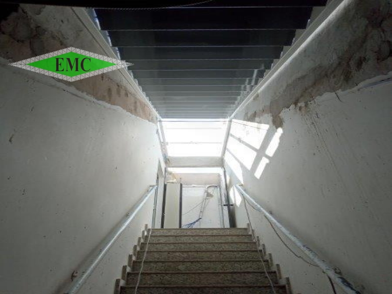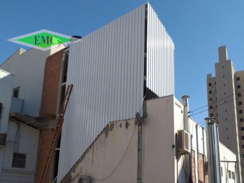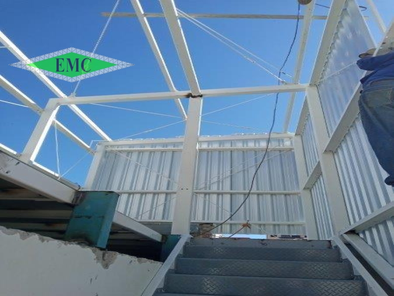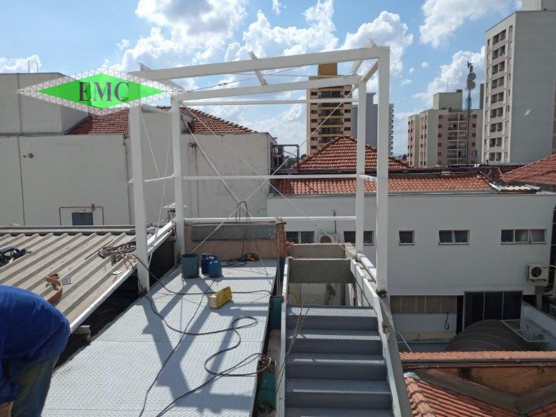 Estrutura Metallica de cobertura para acesso a pavimento superior , estrutura feita sobre edificação existente, o acesso foi feito por escada e mezanino metálico para nova UTI hospitalar , fabricada por perfis dobrados , cantoneiras laminadas , chapa de piso xadrez , a estrutura foi coberta por telhas galvanizadas pintadas.