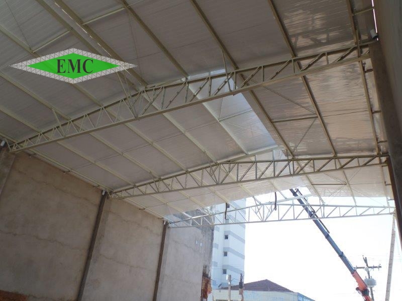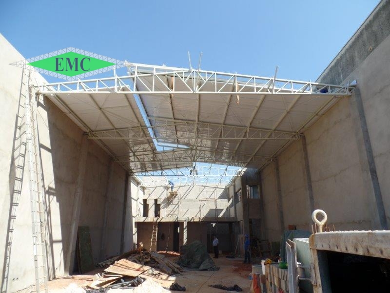 Descrição: Estrutura metálica para galpão comercial , tesoura treliçada tipo finck com shed apoiadas em colunas de concreto , estrutura leve e eficiente.