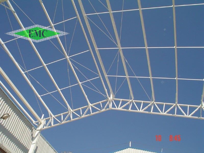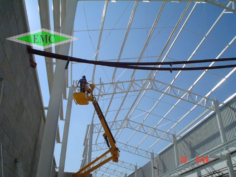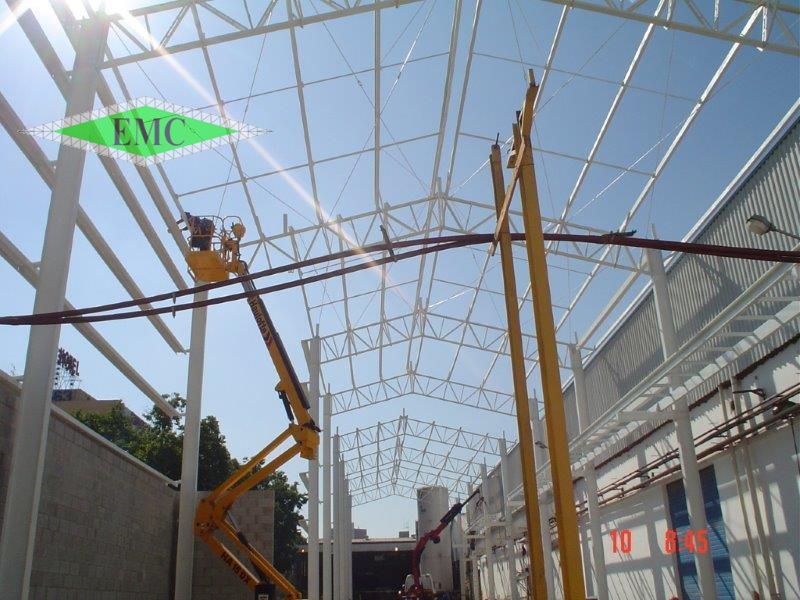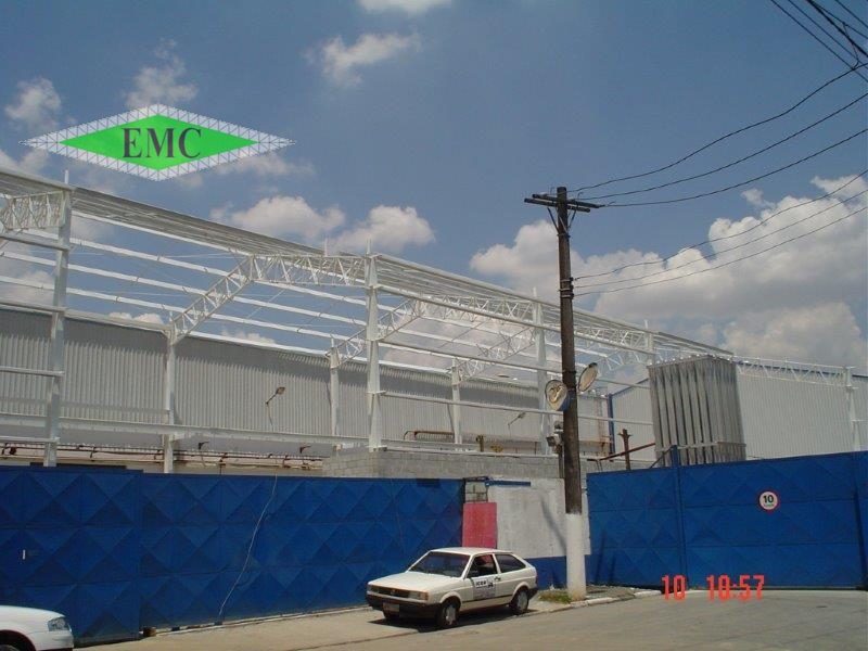 Descrição: Estrutura Metallica com colunas em perfis I laminados e tesoura em banzo paralelo em perfis dobrados , vãos entre tesouras 9,0m e área aproximada de 1400m²